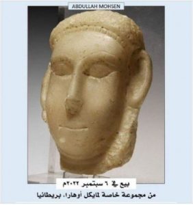 وقال الباحث عبدالله محسن في منشورٍ بصفحته على فيسبوك: إنه تم بيع تمثال رأس رجل منحوت مع غطاء رأس، بمبلغ زهيد في مزاد تايم لاين في لندن.