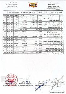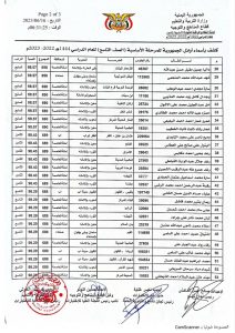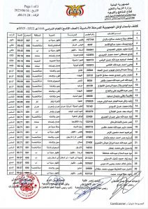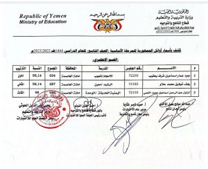 فيما استعرض نائب وزير التربية والتعليم خالد جحادر، أسماء أوائل الجمهورية البالغ عددهم 69 طالباً وطالبة بدءاً بالطالبة عفاف صلاح محمد صالح سكران المركز الأول بنسبة نجاح 99.57 %، وانتهاء بالطالب حمير فارس عبدالمطلب محمد المركز العاشر مكرّر بنسبة نجاح 98.14 %.