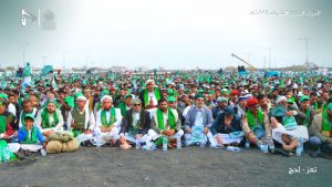 وقد احتشدت الجماهيرُ من مختلف مديريات محافظتَي تعز ولحج، رافعة المصحف الشريف والشعارات والرايات الخضراء والصدح بالمدح المحمدي وترديد الهتافات المؤكّـدة تمسك أبناء المحافظة بالنبي الخاتم.