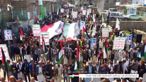 ورفعوا الراياتِ والأعلامَ الفلسطينية واللافتات المعبرة عن تضامن الشعب اليمني مع الأشقاء في فلسطين المحتلّة، والاستنكار الشديد للصمت العالمي تجاه الإرهاب الصهيوني والمذابح اليومية التي يرتكبها العدوّ الإسرائيلي بدعم أمريكي وغربي لا محدود.