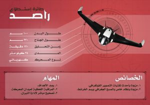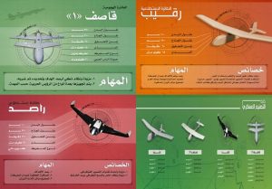 ولفت البيان إلى أن طائراتٍ بدون طيار التي أزاحت الستارَ عنها اليوم دائرة الصنيع العسكري، هي قاصف1 هجومية – وثلاث استطلاعية “راصد ورقيب وهدهد1”.