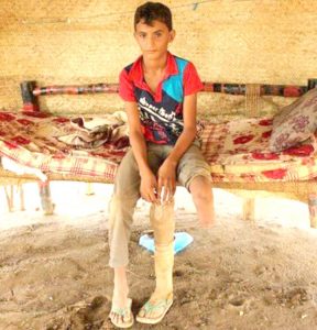 وعندما يضع ساقه الصناعية ونعله الخفيف أخضر اللون، يصبح بوسعه الآن إحضار ماء من الخزان وحفر الفتحات اللازمة لأعمدة الخيام في مخيم النازحين حيث تعيش أُسرته حَالياً الواقع بالقرب من منطقة الخميس.