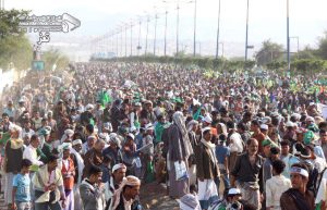وَتقاطَــرَ أبناءُ المحافظة من مختلف المديريات والعُزَل إلى ساحة الاحتفال بشارع المطار، حاملين اللافتاتِ ومردّدين الشعاراتِ والأهازيجَ والمدائحَ المحمدية.
