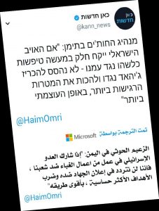الإعلام الصهيوني برمته سواء الناطق بالعبرية أَو الإنجليزية والعبرية أفرد مساحة كبيرة خلال الساعات الماضية والتي أعقبت خطاب قائد الثورة لتحليله، وعلى رأسها القناة العاشرة الصهيونية وقنوات “كان” وَ”i24″ وصحف مثل “يديعوت أحرونوت”، لتناول الخطاب واستضافة المحللين السياسيين والخبراء العسكريين لقراءة أبعاده ورسائله وأهدافه، بالإضافة إلى ترجمة معظم فقرات الخطاب إلى اللغتين العبرية والإنجليزية، وخصوصاً الفقرة التي تضمنت تحذيرات قائد الثورة للكيان الصهيوني وتوعده بضرب عمق الكيان محدّداً أهدافاً حسّاسة رداً على أية حماقة صهيونية ضد اليمن.