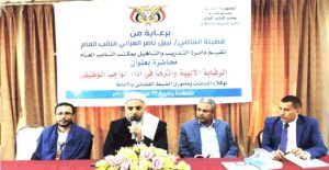 وفي المحاضرة التي شارك فيها عضوُ اللجنة العليا للانتخابات وعضوُ هيئة التفتيش القضائي سابقاً، القاضي على الصامت، أكّـد مفتي الديار اليمنية، أن الدولةَ وجميعَ أجهزتها معنيةٌ بتطوير الأداء فيما يخُصُّ حَلَّ قضايا الناس وتثبيتَ الأمن والاستقرار والحفاظَ على الحقوق والأموال العامة والخَاصَّة، مُشيراً إلى ما يجبُ أن يتمتعُ به القضاة ومأمورو الضبط القضائي من صفات النزاهة والأمانة في حَــلِّ قضايا المواطنين والحكم بالعدل وعدم التطويل في الإجراءات وكذا تحري الصدق والإخلاص والحكم بما أنزل اللهُ والإصلاح والإرشاد والتعاوُن في حَــلِّ النزاعات.