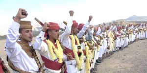 وتخلل العرسَ الجماعي الذي حضره عددٌ من قيادة السلطة المحلية ومشايخ ووجهاء المحافظة، الأهازيج الفرائحية الممزوجة بالفلكور والزوامل الشعبية، وتزين العرسانُ بالأزياء اليمنية التقليدية المستوحاة من منطقتهم ومناطق يمنية أخرى.